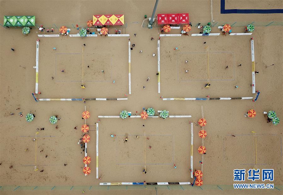 ↑7月19日,选手在比赛中(无人机拍摄)。 当日,2018国际排联世界沙滩排球巡回赛海阳公开赛在山东海阳继续进行。中国男子选手高鹏、李阳组合在当日比赛中以2比1战胜法国组合晋级下一轮。 新华社记者朱峥摄