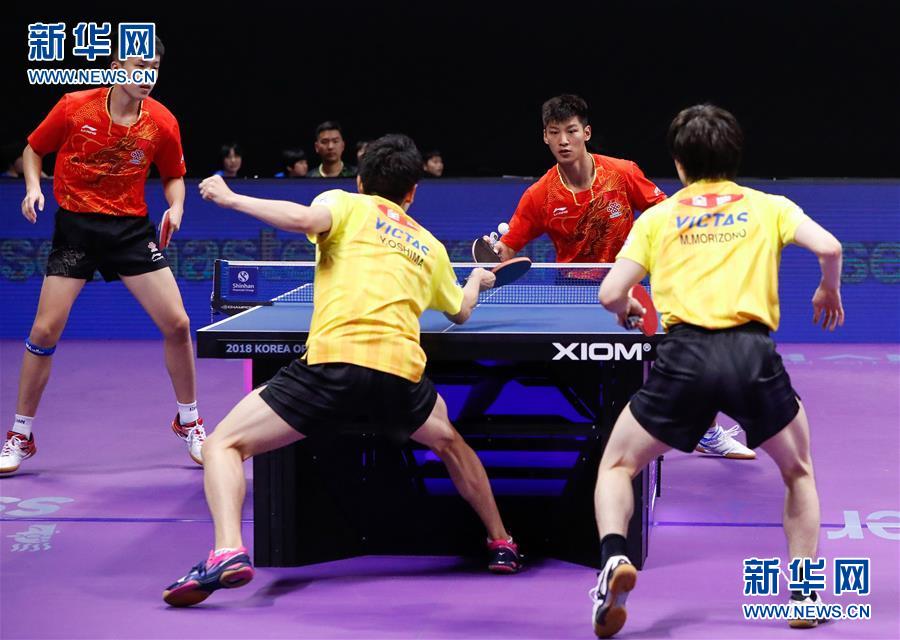 ↑7月19日,王楚钦(左一)/薛飞(右二)在比赛中。 当日,在韩国大田举行的2018国际乒联世界巡回赛韩国公开赛男双八分之一决赛中,中国选手王楚钦/薛飞以3比1战胜日本选手森园政崇/大岛祐哉。 新华社记者王婧嫱摄