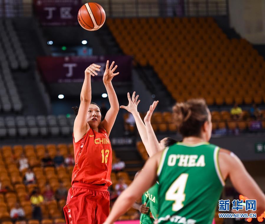 ↑7月16日,中国队球员刘佳岑(左)在比赛中投篮。 新华社记者陶亮摄