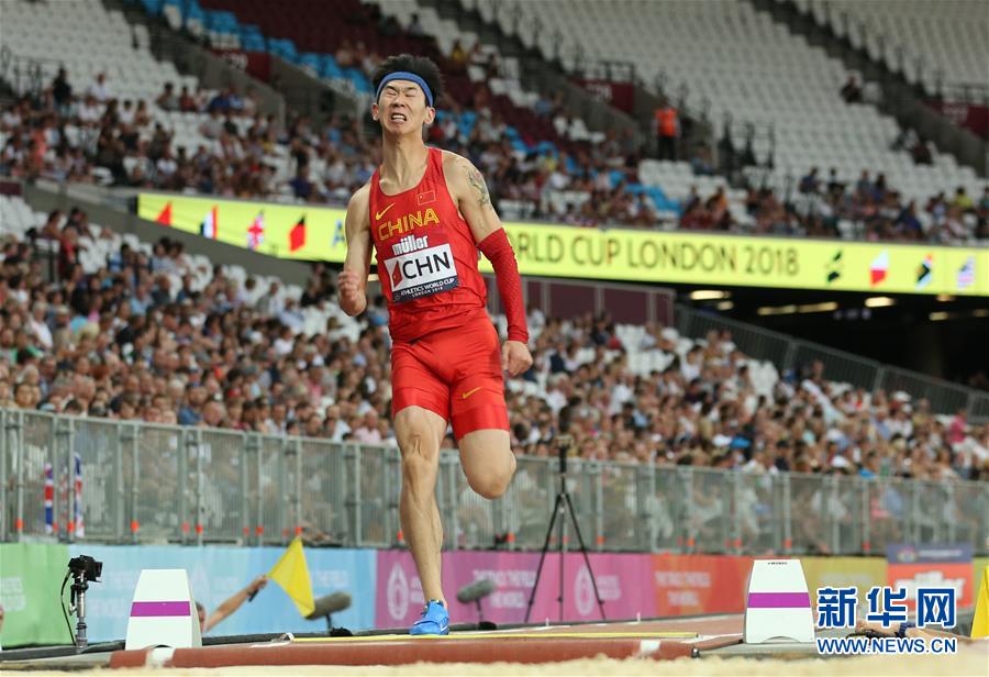 ↑7月15日,黄常洲在男子跳远比赛中。当日,2018年田径世界杯在伦敦进行。中国选手黄常洲在男子跳远比赛中以8米01的成绩获得第五名。 新华社发(伊莎贝尔·因方特斯摄)
