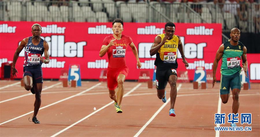 ↑7月15日,许周政(左二)在100米比赛中。 当日,2018年田径世界杯在伦敦进行。中国选手许周政在男子100米比赛中以10秒32的成绩获得第五名。 新华社发(伊莎贝尔·因方特斯摄)