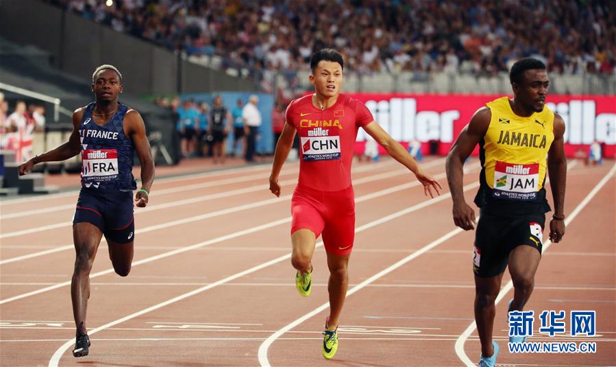 ↑7月15日,许周政(中)在100米比赛中冲刺。 新华社发(伊莎贝尔·因方特斯摄)