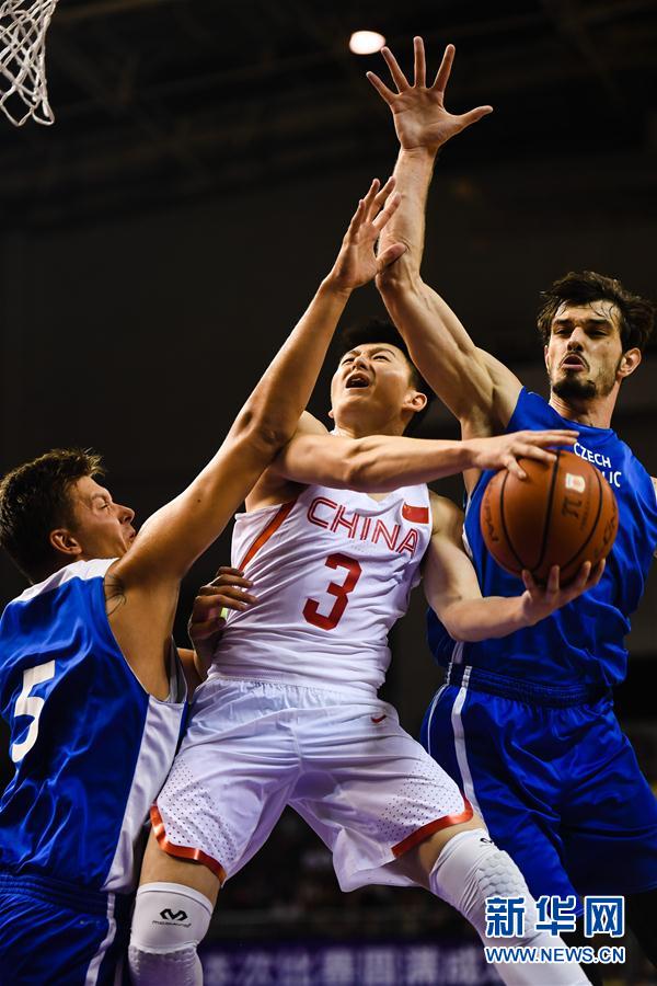 ↑7月19日,中国队球员田宇翔(中)在比赛中上篮。当日,在江苏苏州举行的2018八国男篮争霸赛A组比赛中,中国国奥队以75比67战胜捷克队。新华社记者季春鹏摄