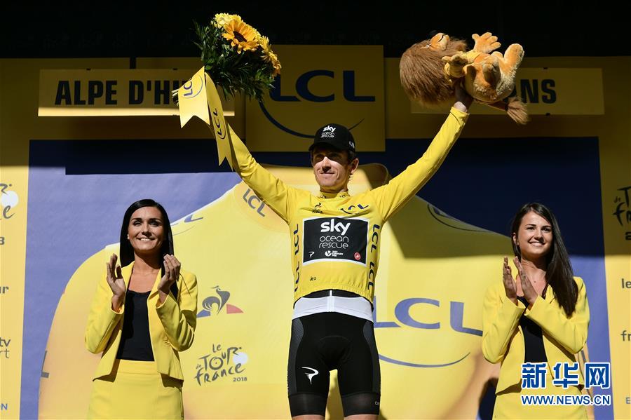 ↑7月19日,天空车队英国车手托马斯(中)在颁奖仪式上庆祝。 当日,2018环法自行车赛结束了第12赛段从圣莫里斯堡到阿尔普迪埃全长175.5公里的争夺,天空车队英国车手托马斯获得赛段冠军,并以49小时24分43秒的总成绩排名第一,继续保有黄色领骑衫。 新华社/法新