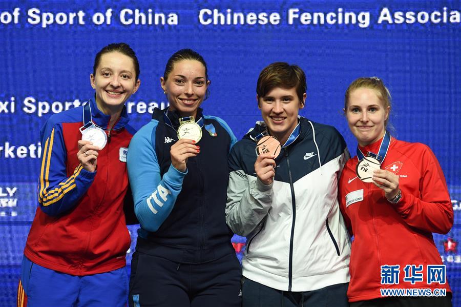 ↑ 7月22日,获得冠军的意大利选手纳瓦利亚(左二)、获得亚军的罗马尼亚选手波佩斯库(左一)、并列季军的美国选手赫利(右二)和瑞士选手斯塔利在颁奖仪式上展示奖牌。 当日,在2018世界击剑锦标赛女子重剑个人决赛在江苏无锡举行。 新华社记者李博摄