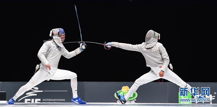 ↑7月22日,韩国选手金政焕(右)与美国选手德什威茨在比赛中。 当日,在2018世界击剑锦标赛男子佩剑个人决赛中,韩国选手金政焕以15比11战胜美国选手德什威茨,夺得冠军。 新华社记者李博摄
