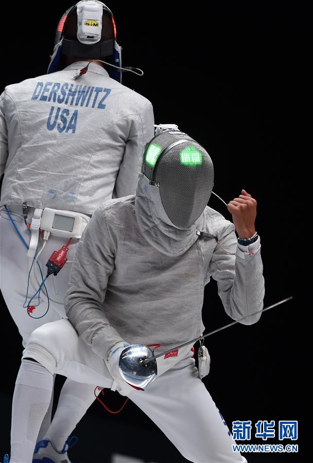 ↑7月22日,韩国选手金政焕(前)在比赛中庆祝得分。 当日,在2018世界击剑锦标赛男子佩剑个人决赛中,韩国选手金政焕以15比11战胜美国选手德什威茨,夺得冠军。 新华社记者韩瑜庆摄