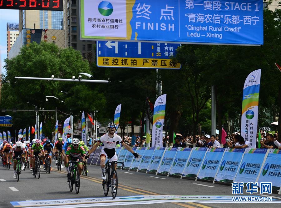 ↑7月22日,宁夏体彩LIVALL车队车手乔治·宝格拉斯(右一)冲过终点线。 当日,第十七届环青海湖国际公路自行车赛在青海省海东市乐都区鸣枪开赛,来自宁夏体彩LIVALL车队的乔治·宝格拉斯以3小时56分05秒的成绩获得赛段冠军。乔治·宝格拉斯同时获得象征冲刺王的绿衫和象征总成绩第一的黄衫。 新华社记者吴刚摄