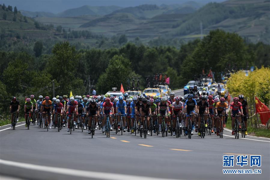 ↑7月22日,参赛选手在比赛中骑行。 当日,第十七届环青海湖国际公路自行车赛在青海省海东市乐都区鸣枪开赛。 新华社记者吴刚摄