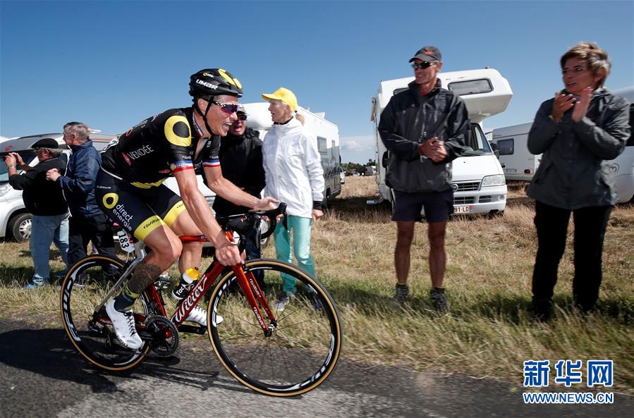 ↑ 7月22日,直接能源车队的法国车手西尔万·沙瓦内尔在比赛中。 当日,2018环法自行车赛第15赛段结束了从米约到卡尔卡松全长181.5公里的争夺。阿斯塔纳车队的丹麦车手尼尔森获得冠军,天空车队车手托马斯仍然排名总成绩第一,继续身穿黄色领骑衫。 新华社/路透
