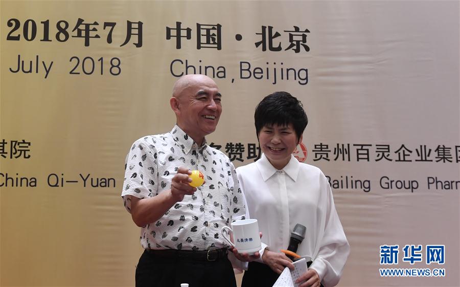 ↑7月23日,元老组日本棋手武宫正树(左)在抽签仪式上展示结果。新华社记者贾宇辰摄