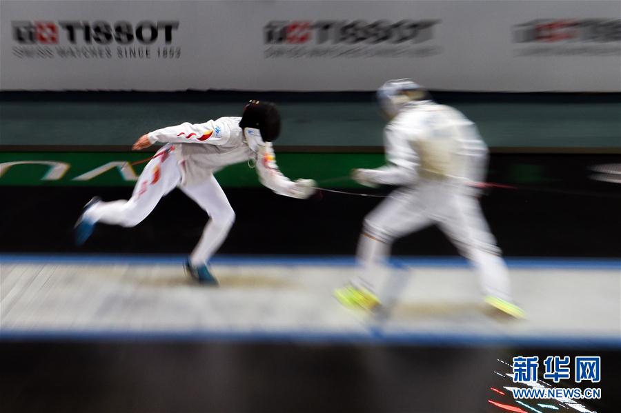 ↑ 7月24日,吴斌(左)在比赛中。 当日,在江苏省无锡市举行的2018世界击剑锦标赛男子花剑个人赛64进32的比赛中,中国选手吴斌以15比12战胜乌克兰选手罗斯特斯拉夫,晋级32强。 新华社记者李博摄