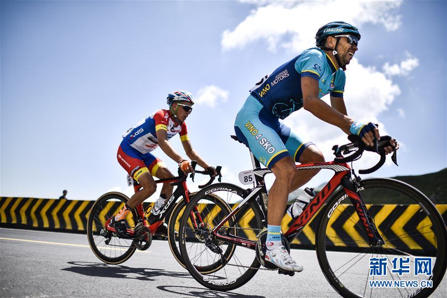 ↑ 7月24日,哈萨克斯坦维诺阿斯塔纳车队选手卡梅舍夫·阿尔曼(右)在比赛中骑行,他最终获得象征本赛段亚洲最佳的蓝衫。 新华社记者吴刚摄