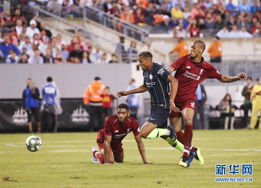 ↑7月25日,利物浦队球员塔瓦雷斯(右)与曼城队球员恩梅查在比赛中争抢。 新华社记者王迎摄