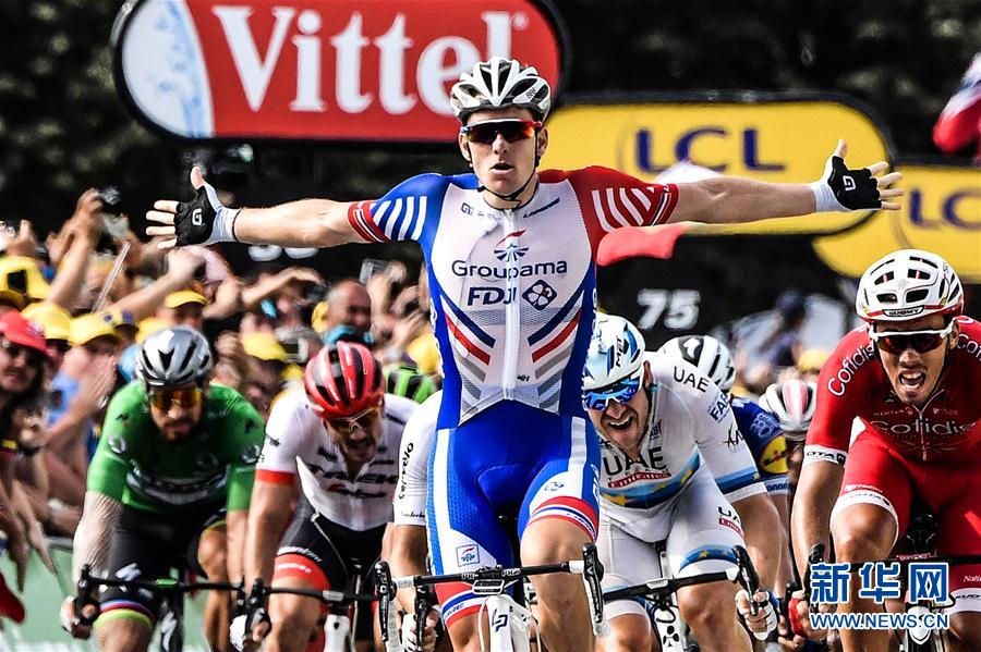 ↑7月26日,FDJ车队的法国车手德马尔(前)在冲线后庆祝。 新华社/法新