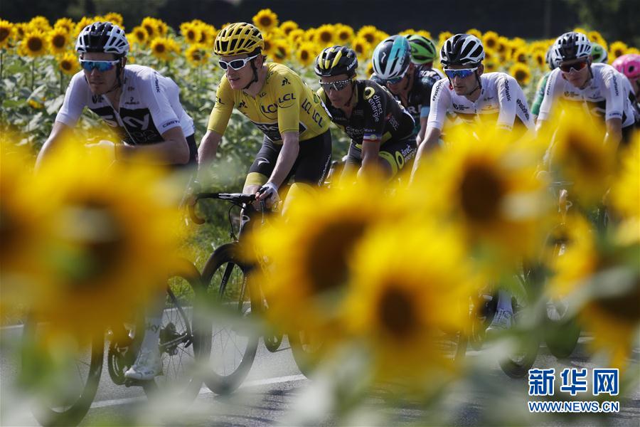 ↑7月26日,身着黄色领骑衫的天空车队英国车手托马斯(左二)在比赛中。 新华社/美联