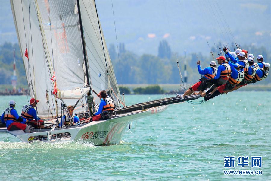 ↑7月26日,选手们操作帆船行驶在湖面上。 新华社发(弗勒什·西拉德摄)