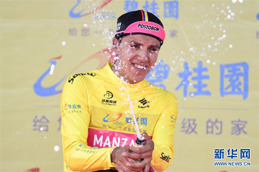 ↑7月26日,获得黄衫的哥伦比亚曼萨纳车队选手赫尔南·阿吉雷在颁奖仪式上喷洒香槟。 当日,第十七届环青海湖国际公路自行车赛展开第五赛段——龙羊峡至鸟岛段的角逐。 新华社记者吴刚摄