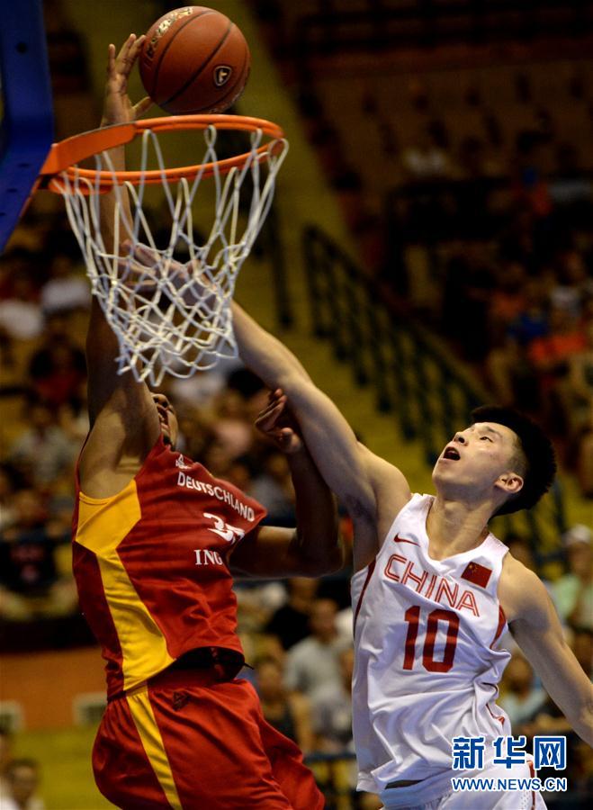 ↑7月26日,中国队球员张祖铭(右)在比赛中防守德国队球员卡利姆·亚罗。 新华社记者李一博摄