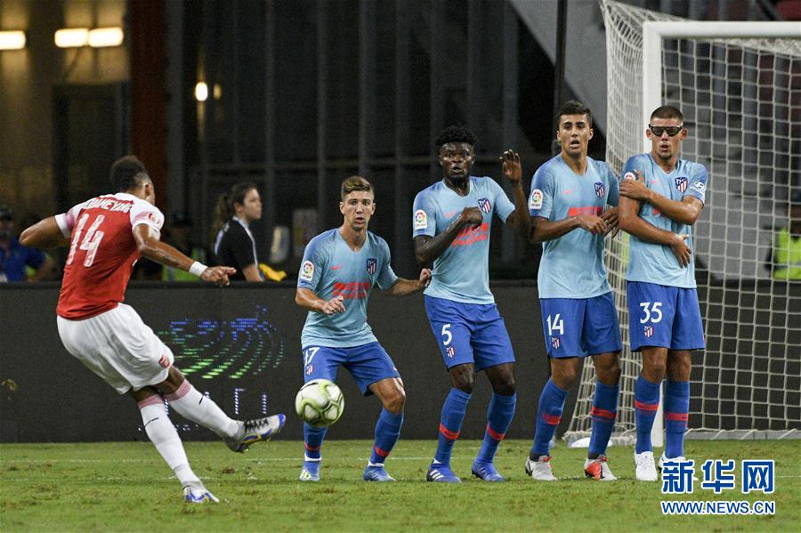 ↑7月26日,马德里竞技队球员在比赛中防守阿森纳队球员奥巴梅杨(左一)主罚的任意球。 新华社发(邓智炜摄)