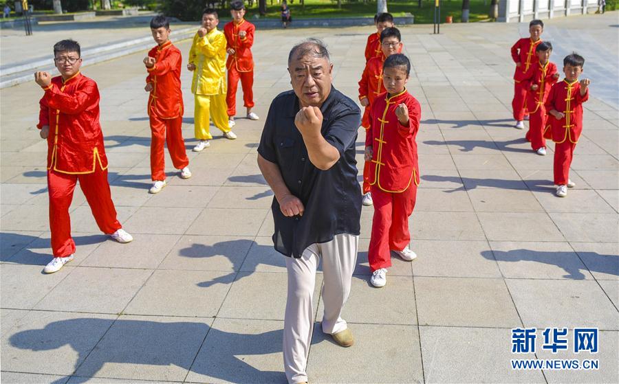 ↑7月26日,张玉林(前)带领学生练形意拳。新华社记者李晓果摄