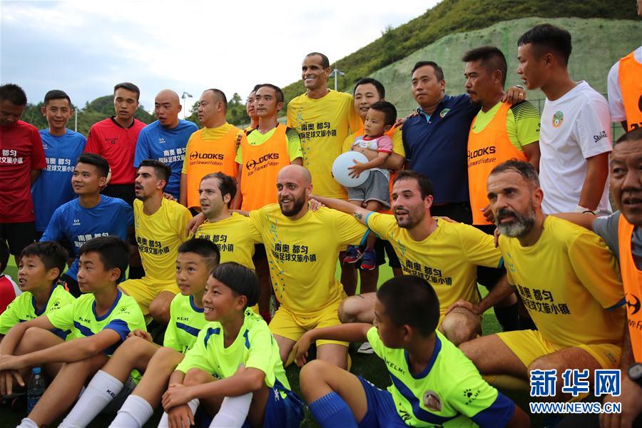 ↑7月27日,里瓦尔多(后排中)与当地球迷合影。新华社记者刘续摄