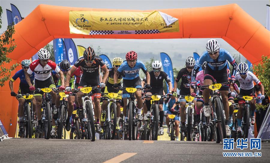 7月29日,山地车男子精英组参赛选手在比赛中出发。 当日,以“中国古都天下大同”为主题的第五届大同国际自行车骑游大会进入第二个比赛日。新华社发(陈晓伟摄)