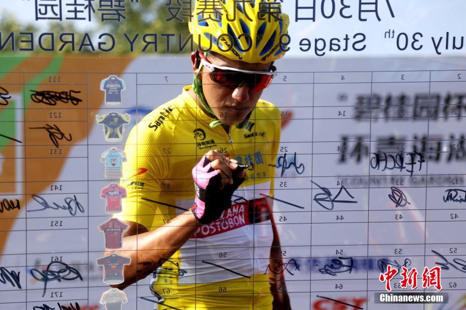 7月30日,本赛段比赛开始前正在签到的上赛段黄衫得主。当日,“碧桂园杯”2018环青海湖国际公路自行车赛从甘肃省金昌市出发,拉开了第九赛段金昌至武威的赛程。虽然没有了高海拔和爬坡的难度,但34℃的炎热天气为选手们带来了新的挑战。本赛段全程175公里,共设立三个冲刺点,平均海拔1500米左右,赛道主要以城市公路、高速公路为主。在激烈的角逐中,冲刺阶段有选手摔伤,最终,土耳其托库车队51号巴尔干·奥努尔历时3小时55分50秒抢先撞线,拿下本赛段第一名。中新社记者 马铭言 摄