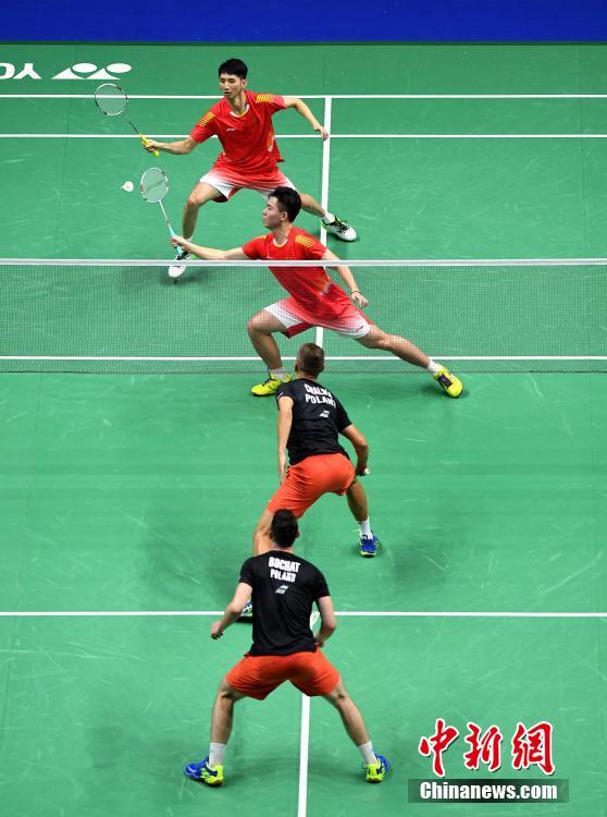 7月30日,2018年世界羽毛球锦标赛在南京拉开帷幕,中国男双选手韩呈恺/周昊东(红)2:0战胜波兰选手博哈特/克瓦林纳,首轮顺利过关。中新社记者 侯宇 摄