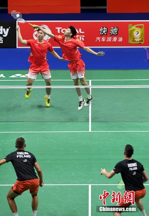 7月30日,2018年世界羽毛球锦标赛在南京拉开帷幕,中国男双选手韩呈恺/周昊东(红)2:0战胜波兰选手博哈特/克瓦林纳,首轮顺利过关。中新社记者 侯宇 摄