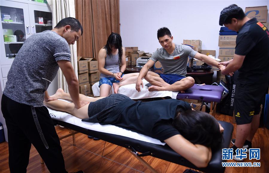 ↑7月30日,钟齐鑫(右二)在一天的训练结束后接受理疗。新华社记者陶希夷摄