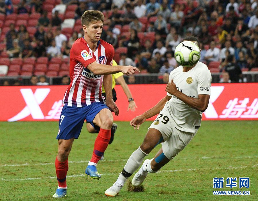 ↑7月30日,马德里竞技队球员卢西亚诺(左)与巴黎圣日尔曼队球员安托万在比赛中拼抢。 新华社发(邓智炜摄)