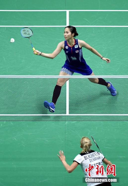 7月31日,2018年世界羽毛球锦标赛第二比赛日在南京举行,泰国选手因达农(蓝)在女单第二轮比赛中苦战三局,以2:1逆转战胜丹麦选手布利希费尔特,晋级下一轮。中新社记者 侯宇 摄