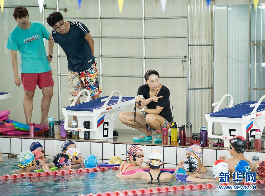 ↑7月31日,一名教练在陈经纶体校游泳馆指导学员训练。 新华社记者翁忻旸摄