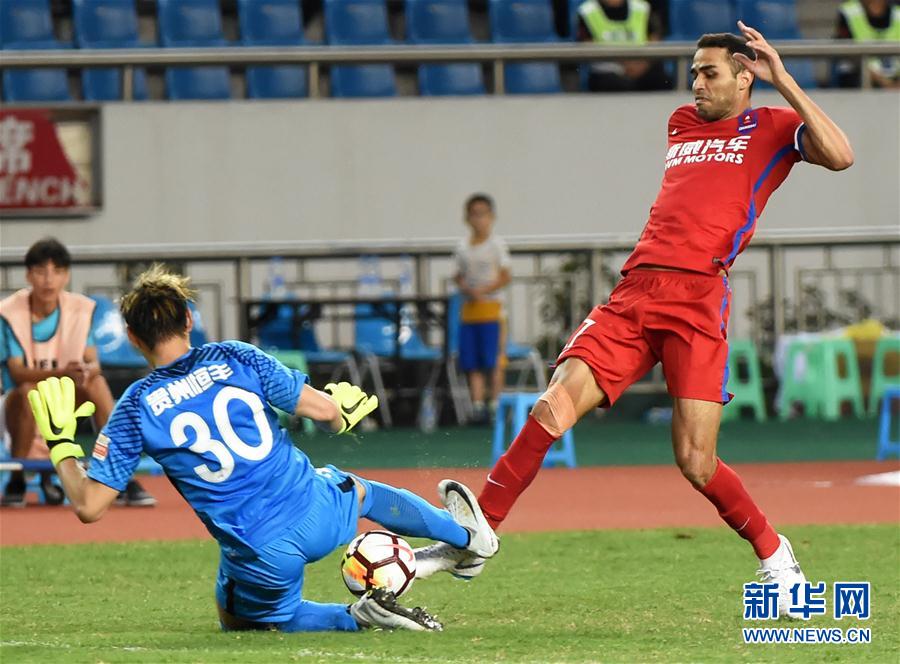 ↑ 8月1日,贵州恒丰队门将张思鹏(左)封堵重庆斯威队球员卡尔德克的进攻。 当日,在2018赛季中超联赛第15轮比赛中,贵州恒丰队客场以4比3战胜重庆斯威队。 新华社记者唐奕摄