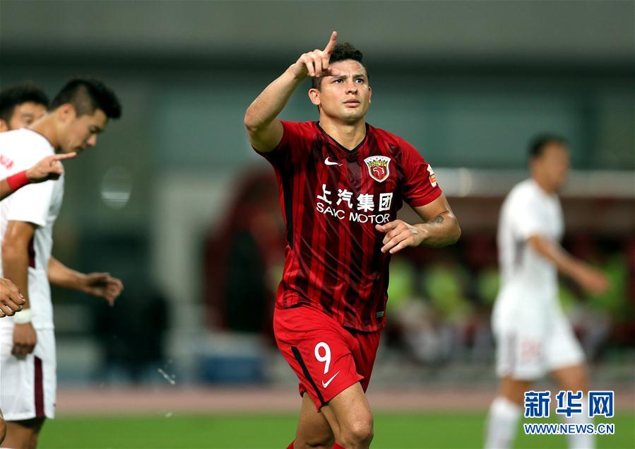 ↑8月1日,上海上港队球员埃尔克森庆祝进球。 当日,在2018赛季中超联赛第15轮比赛中,上海上港队主场以4比1战胜天津权健队。 新华社记者凡军摄