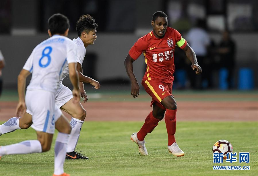 ↑8月1日,长春亚泰队球员伊哈洛(右)在比赛中带球进攻。 当日,在2018赛季中超联赛第15轮比赛中,长春亚泰队主场以3比0战胜大连一方队。 新华社记者许畅摄