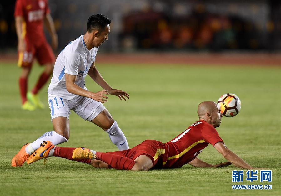 ↑8月1日,长春亚泰队球员阿德里安(右)在比赛中被对手侵犯倒地。 新华社记者许畅摄