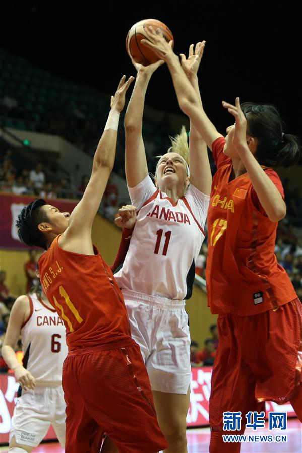 ↑8月1日,中国队球员黄思静(前左)、韩旭(前右)在比赛中防守加拿大队球员阿历克斯·K-R。 新华社记者张加扬摄