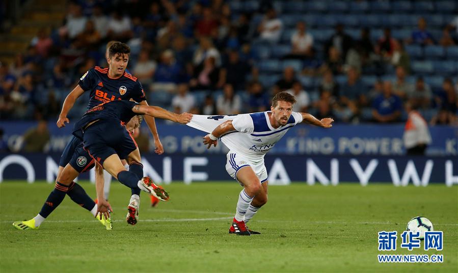 ↑8月1日,莱斯特城队球员富克斯(右)与巴伦西亚队球员瓦斯在比赛中拼抢。 新华社/路透