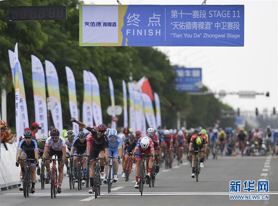 ↑ 8月2日,芬兰米捷亚车队选手蒂珀·雅各布(前)以赛段第一成绩冲刺过线。 当日,第十七届环青海湖国际公路自行车赛展开第十一赛段——中卫绕圈赛的角逐。 新华社发(张龙摄)