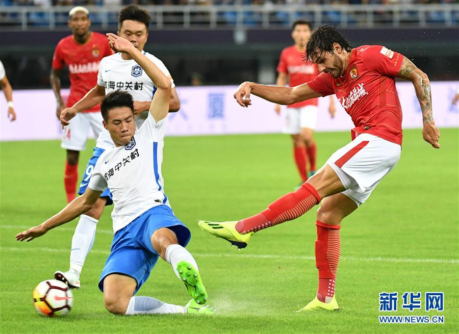 ↑8月2日,广州恒大淘宝队球员高拉特(右)在比赛中射门。 新华社记者李然摄