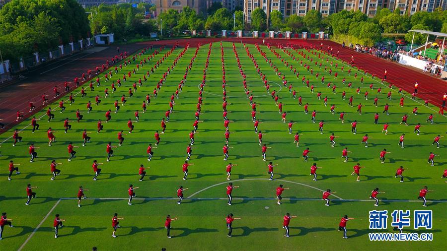 8月4日,在江苏省南通市竹行小学,青少年在“武术大合练”中表演(无人机拍摄)。  新华社发(许丛军 摄)