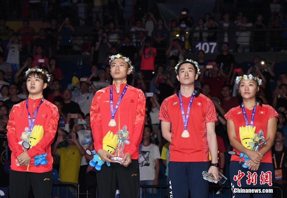 8月5日,2018年世界羽毛球锦标赛决赛在南京进行,中国组合张楠/李茵晖和中国香港组合邓俊文/谢影雪并列获得混双季军。 中新社记者 侯宇 摄