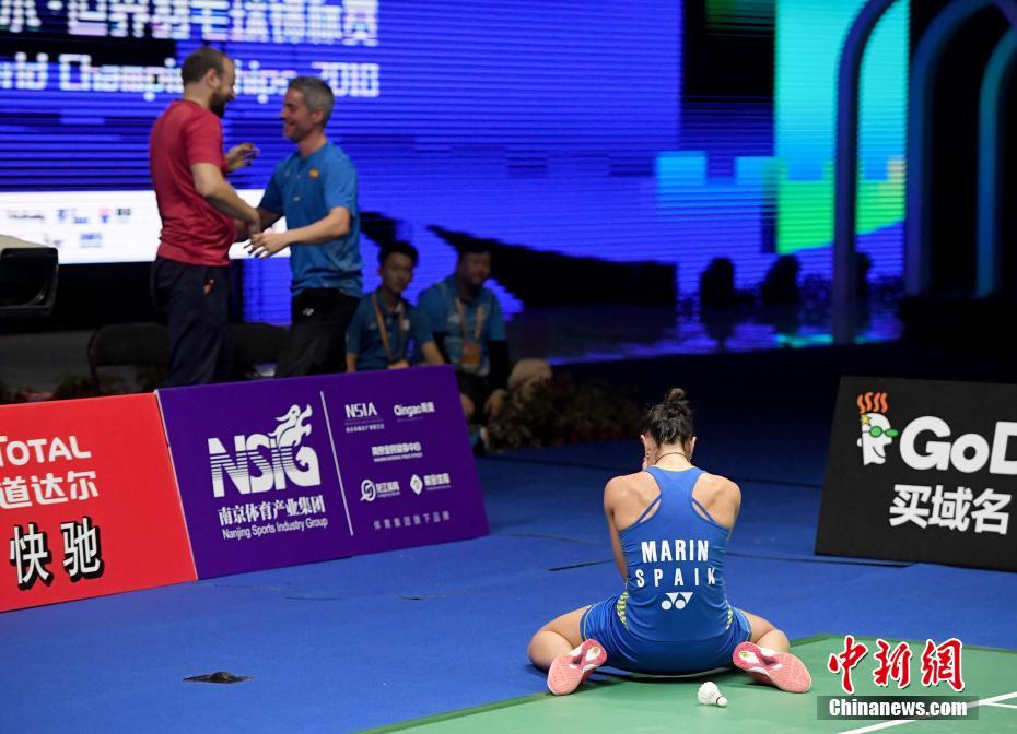 8月5日,2018年世界羽毛球锦标赛各项决赛在南京进行,西班牙选手马琳以2:0战胜印度选手辛杜,获得女单冠军。图为马琳获得制胜分瞬间。 中新社记者 侯宇 摄