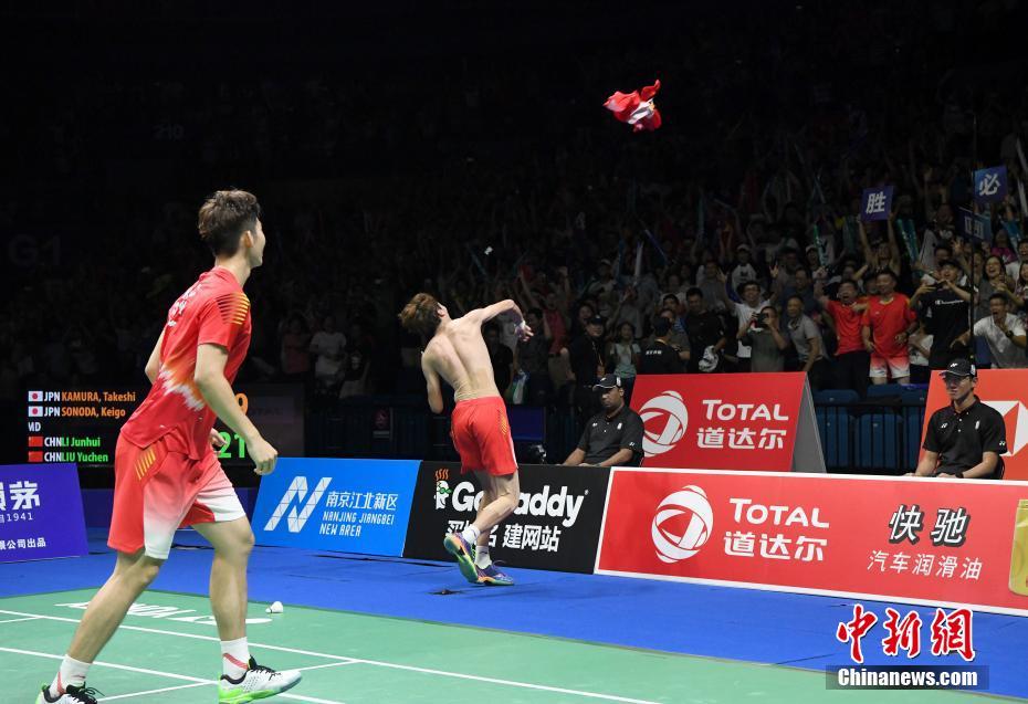 8月5日,2018年世界羽毛球锦标赛各项决赛在南京进行,中国组合李俊慧/刘雨辰2:0战胜日本组合嘉村健士/园田启悟,获得男双冠军。图为中国队夺冠后将球衣抛向观众。中新社记者 侯宇 摄
