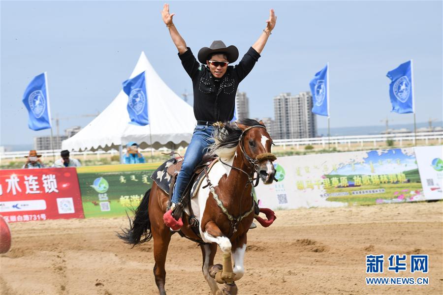 ↑8月5日,骑手隋博庆祝获胜。他以16.647秒的成绩夺得冠军。新华社记者刘磊摄