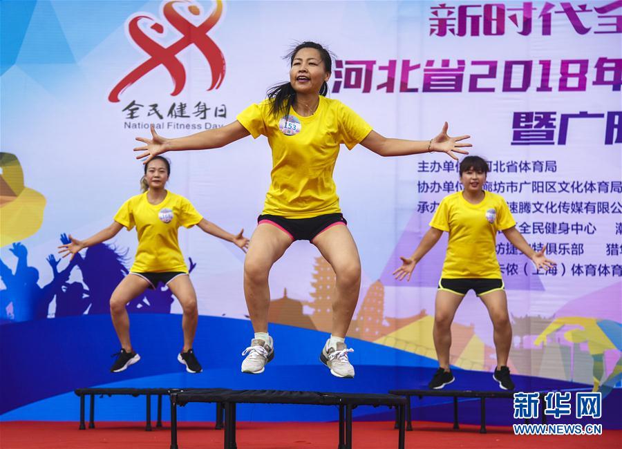 ↑8月5日,在河北省廊坊市广阳区人民公园,体育健身队在进行蹦床表演。新华社记者李晓果摄