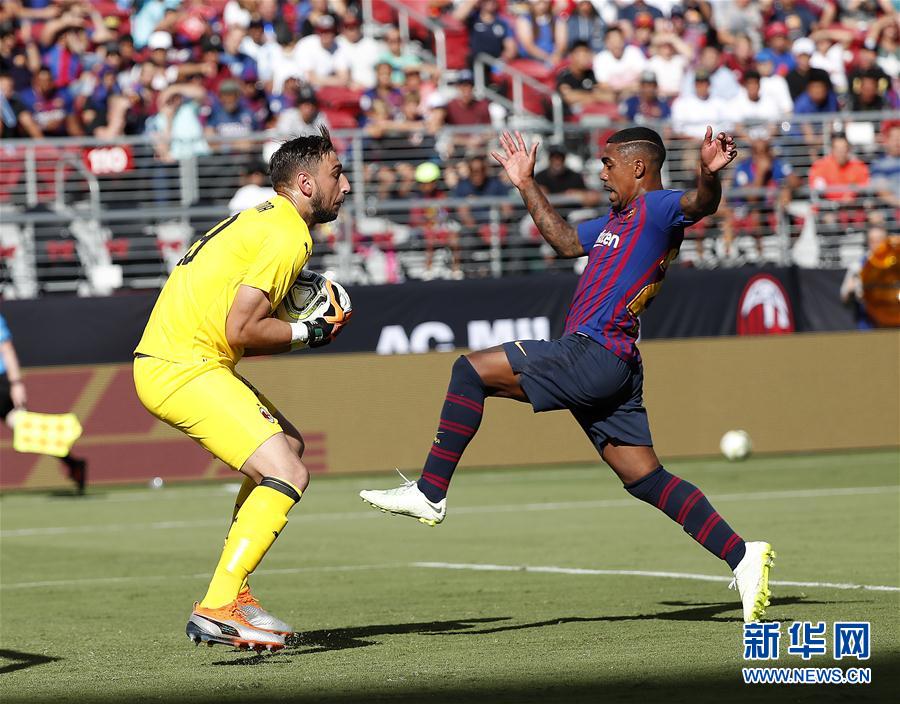 ↑8月4日,AC米兰队门将多纳鲁马(左)阻截巴塞罗那队球员马尔科姆·席尔瓦的射门。新华社/美联
