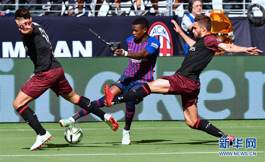 ↑8月4日,巴塞罗那队球员塞梅多(中)与AC米兰队球员里·罗德里格斯(左)和博里尼拼抢。新华社/法新